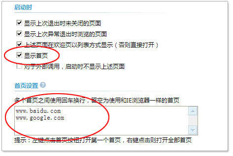 如果您设置的首页没有自动显示,请检查360安全浏览器选项设置,确认启动时显示首页项目是选中状态,如下图: